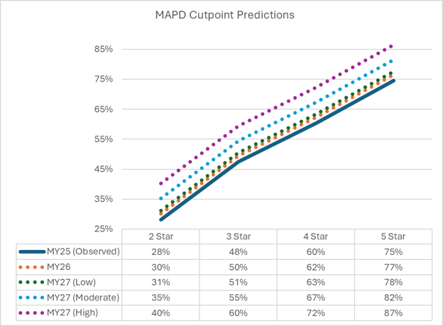 Plans that do not start MY27 well above the lower prediction bands — ideally, operating early in the year at or near the moderate scenario levels — may find themselves effectively locked out of 4 and 5star territory, even if their performance improves later in the year.