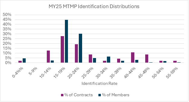 Our MY25 analysis shows that actual identification rates across plans are substantially higher than CMS’s expected national identification rate of 13%, which CMS used when finalizing the MTMP expansion.